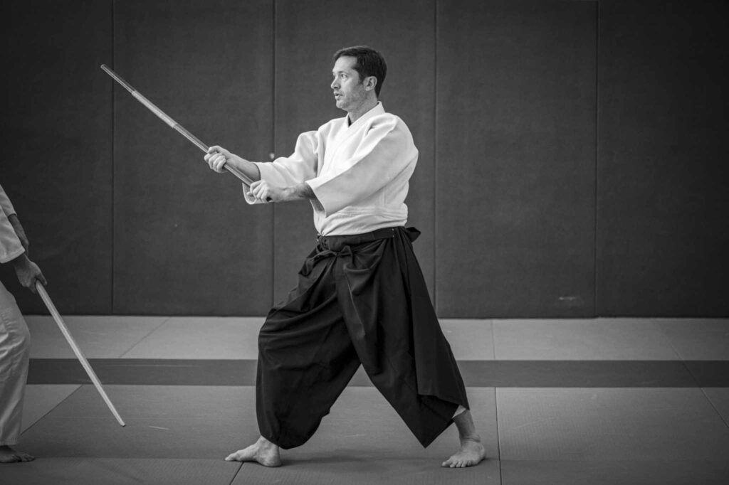 Formé au Japon auprès de maîtres reconnus, il transmet aujourd’hui un travail précis, fluide et rigoureux autour des trois armes fondamentales :